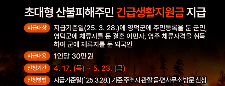 초대형 산불피해로 어려움을 겪고 있는 영덕군민의 생활안정과 사회기본권 보장 및 지역경제 활성화를 위해 초대형 산불피해주민 긴급생활지원금을 지급하고자 다음과 같이 공고합니다. 1. 공