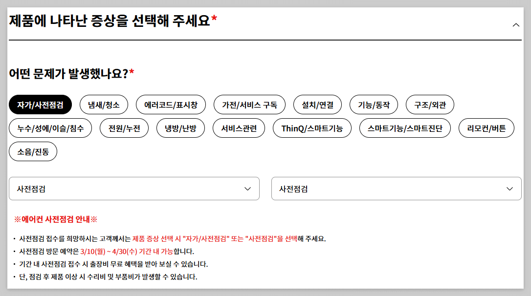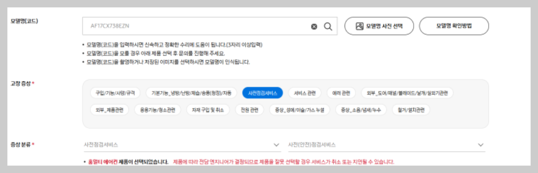 - 모델명 선택 - 증상(사전점검 서비스) 선택 후 예약