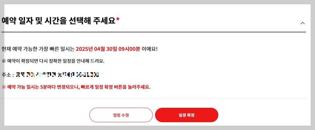 - 예약 일자 및 시간선택 : 가장 빠른 일시가 확인되고 일정 확정 또는 일정 수정으로 일시 변경(일시 변경은 추후에도 가능)