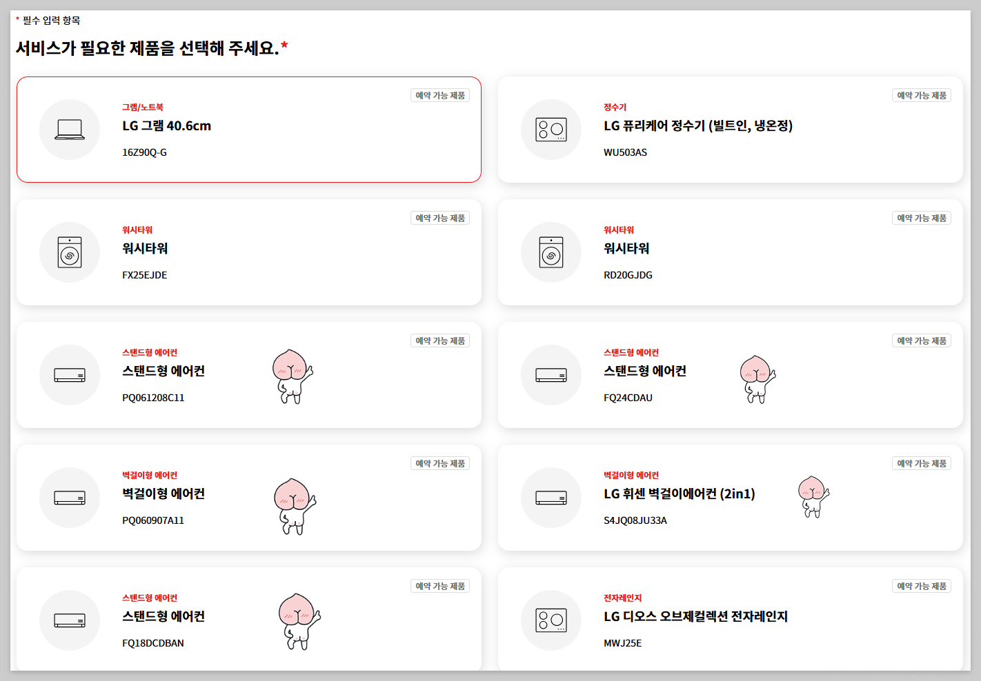 - [선택 1] 서비스가 필요한 제품 선택 - 스탠드형 / 벽걸이 선택(모델명 확인)