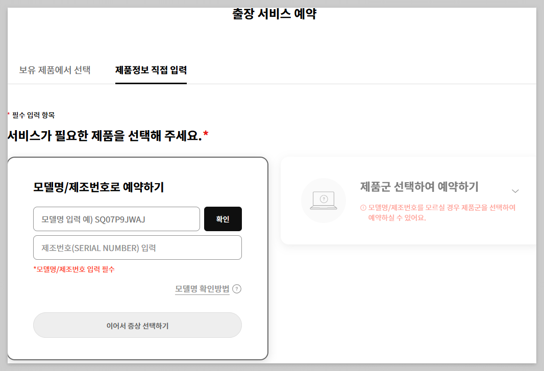 - [선택 2] 보유 제품에서 선택이 아닌 제품정보(모델명/제조번호) 직접 입력