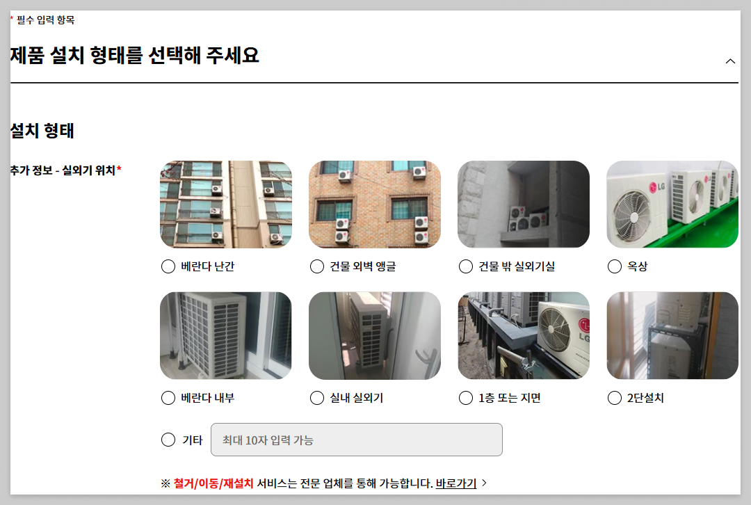 - [선택 1] 또는 [선택 2] 후 제품 설치 형태 선택 - 실외기 위치