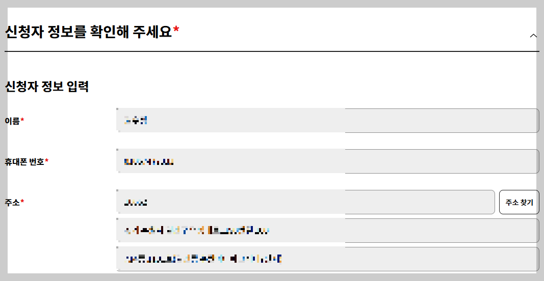 - 신청자 정보 확인 - 이름 - 휴대폰 번호 - 주소 입력