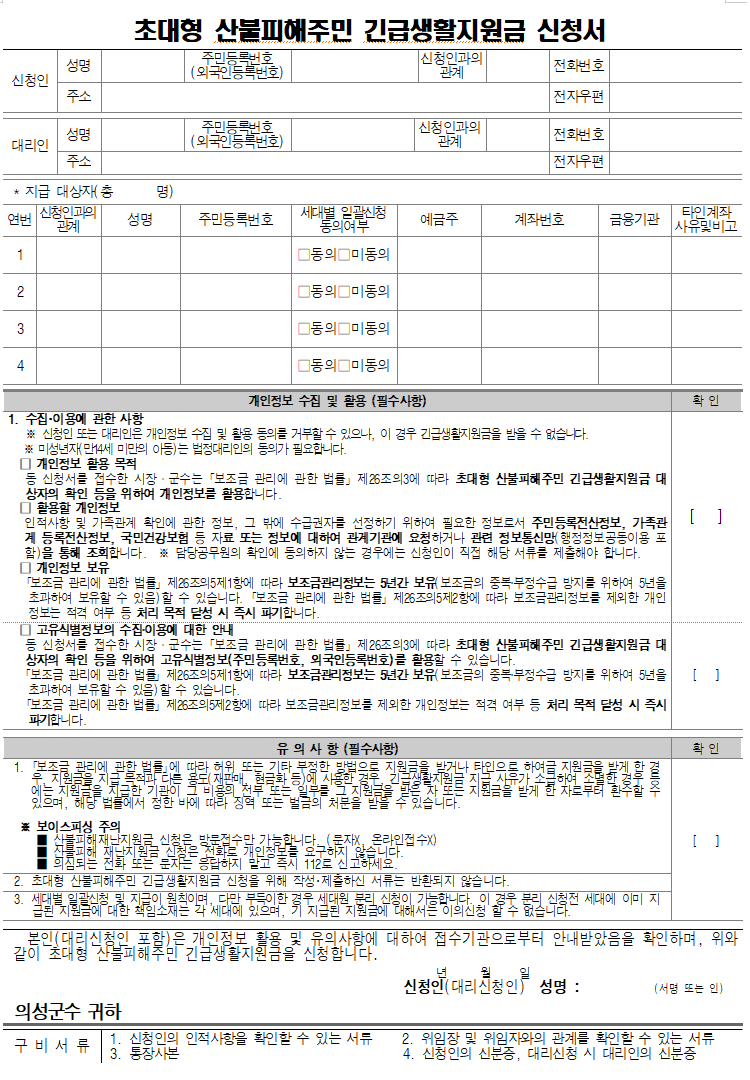 | ▶ 신청 구비서류 : 긴급생활지원금신청서, 신분증 및 통장사본 (대리인 신청시) 신분증, 위임장, 가족관계증명서 등 관계를 증명할 수 있는 서류 |