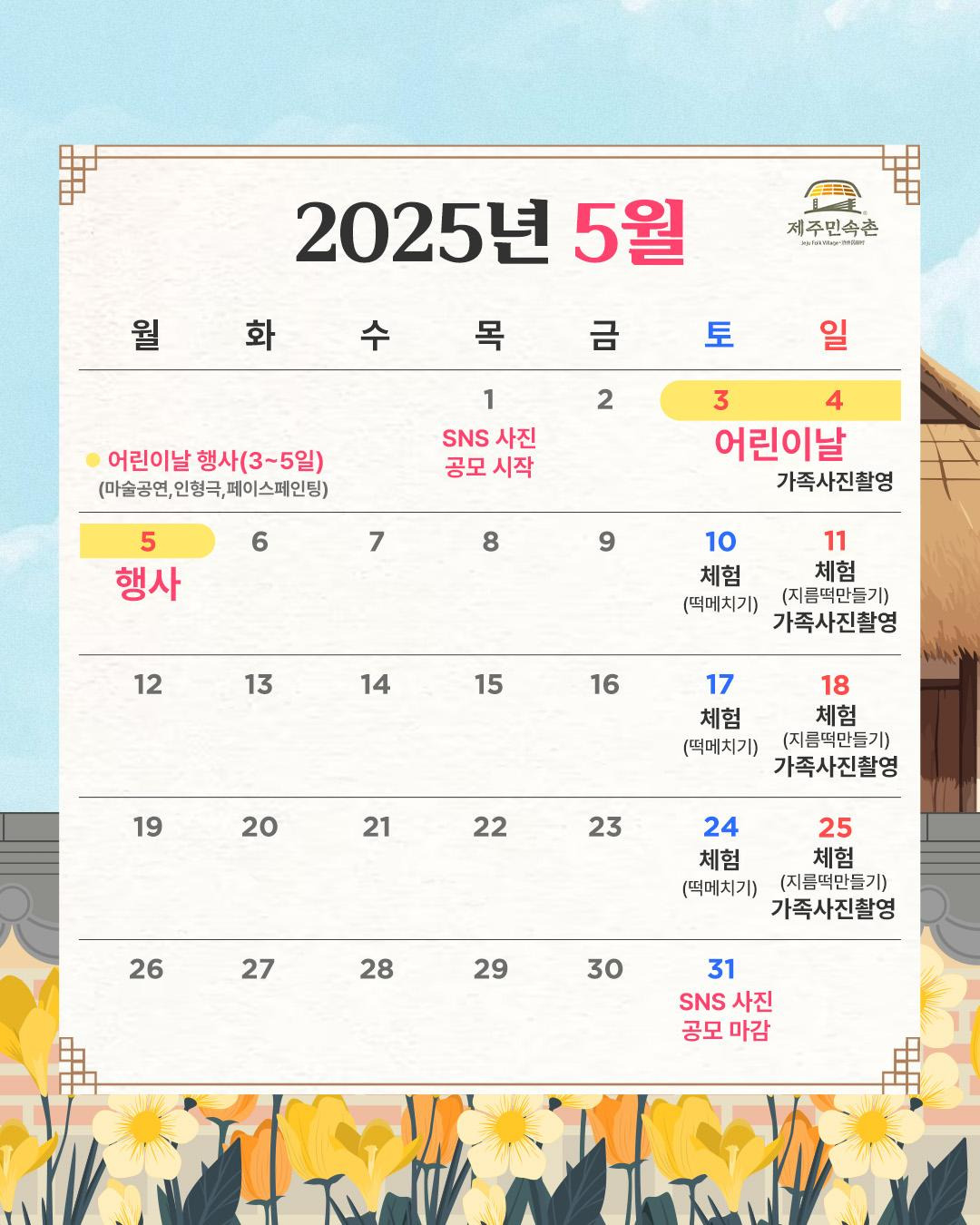 | 제주민속촌 ’옛 전통 봄꽃으로 물들다‘ | 서귀포시 표선면 | 2025. 5. 1.(목) ~ 5. 31.(토) |